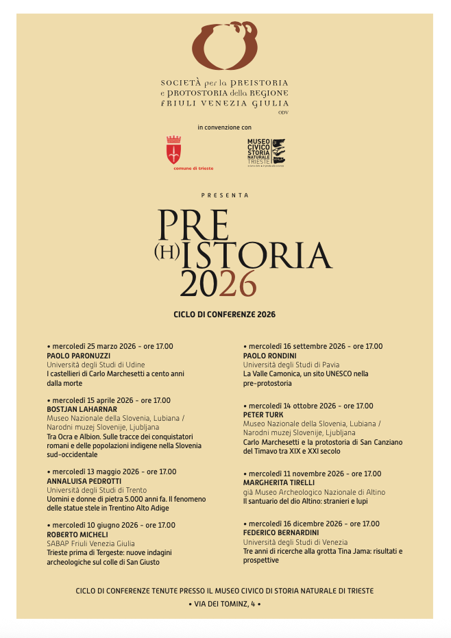 Anche quest’anno la Società per la Preistoria e la Protostoria della Regione Friuli Venezia Giulia propone il ciclo di conferenze “Preistoria 2026” nell’ambito della convenzione per la promozione e valorizzazione dell’archeologia preistorica-protostorica stipulata con il Comune di Trieste.